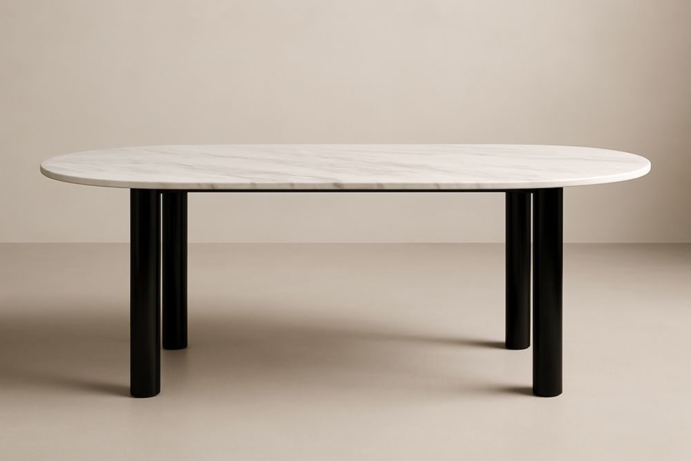 Table de repas ovale avec plateau en marbre et pieds en aluminium noir